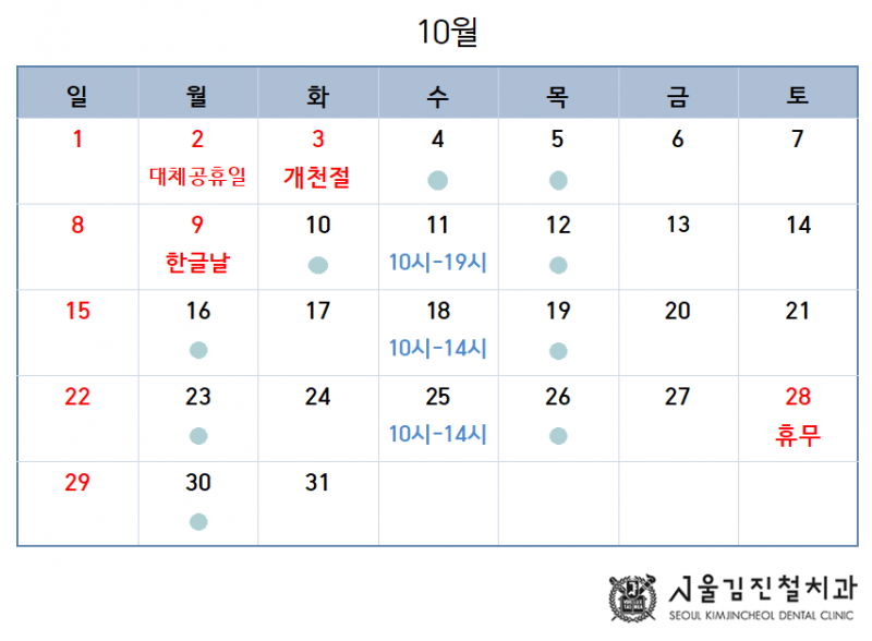 10월 2일(대체공휴일), 3일(개천절), 9일(한글날)은 휴진입니다.