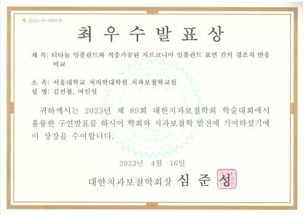 대한치과보철학회 최우수발표상 수상